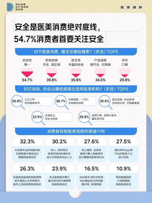 安全底线%消费者首要关注安全性。价格透明(38.7%)与医生资质(35.6%)成关键决策因素,行业不规范行为遭遇零容忍。